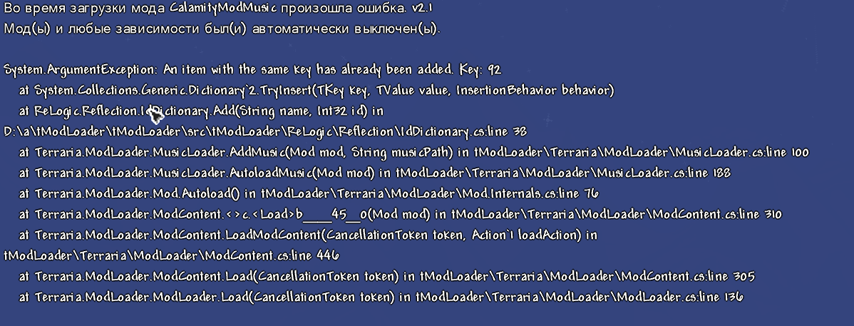сегодн6я скачал каламити мод и при попытке загрузить calamity mod music вылетает ошибка
