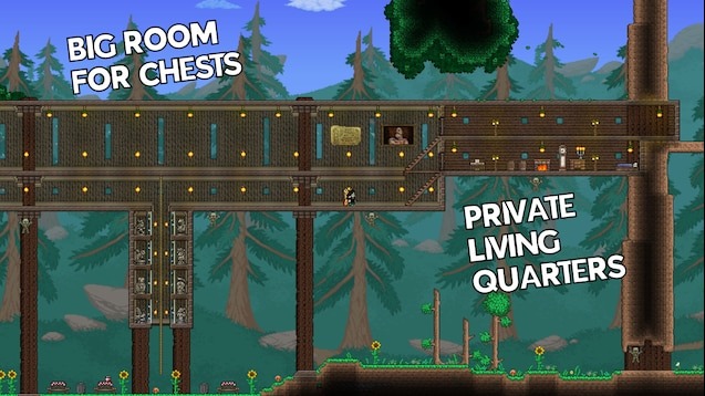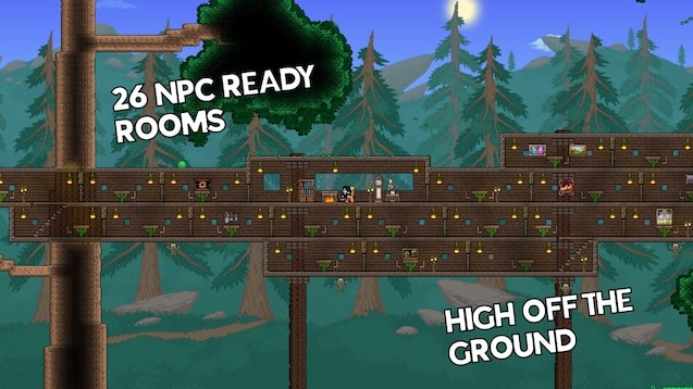 Tree House Base V2 подойдёт игрокам, ищущим эстетичную и практичную стартовую базу в Terraria. Она совмещает простоту постройки и функциональность, обеспечивая удобное размещение всех NPC в одной красивой локации.