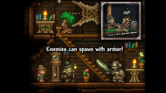 - Система брони: Враги могут появляться в до трёх предметах железной брони (шлем, кираса, поножи). Броня блокирует первый удар, но может быть сбита и запущена, снижая защиту врага.
