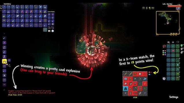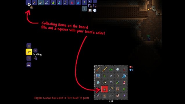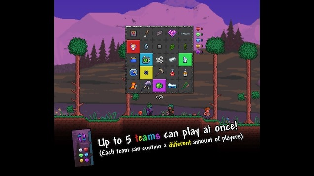 - Поддержка команд: Используются встроенные в Terraria 5 командных цвета; команды соревнуются за сбор 25 уникальных предметов.