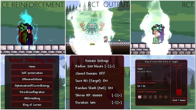 Мод KingOfCurses Beta (JJK mod) для Terraria находится в активной разработке и добавляет контент, вдохновлённый вселенной Jujutsu Kaisen, в частности персонажем Рёмэн Сукуной. Он привносит в игру набор предметов и механик, позволяющих частично воссоздать его способности, однако проект всё ещё далёк от финальной версии, поэтому баланс, стабильность и общая полировка могут быть нестабильными.