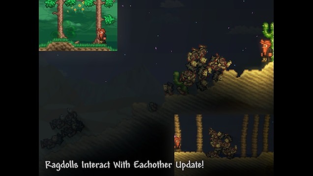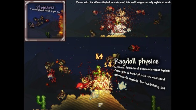 Physaria добавляет реалистичную физику смерти врагов в Terraria, превращая обычные кровавые взрывы в динамические рэгдоллы с эффектами расчленения и физически корректным поведением частиц крови. Все изменения полностью косметические и совместимы с любыми другими модами. Мод включает патчи совместимости для наиболее популярных дополнений.