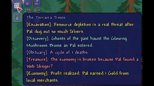 The Terraria Times создает атмосферу живого мира, где любые ваши действия — от убийства босса до жалких попыток добыть руду — могут оказаться на первой полосе. Мод добавляет специального NPC-разносчика, собственную систему рубрик и гибкие настройки подачи новостей.