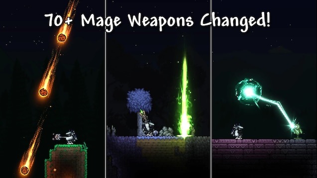 - Полная переработка визуальных эффектов: Улучшение анимаций, частиц и спецэффектов почти для всех магических оружий.