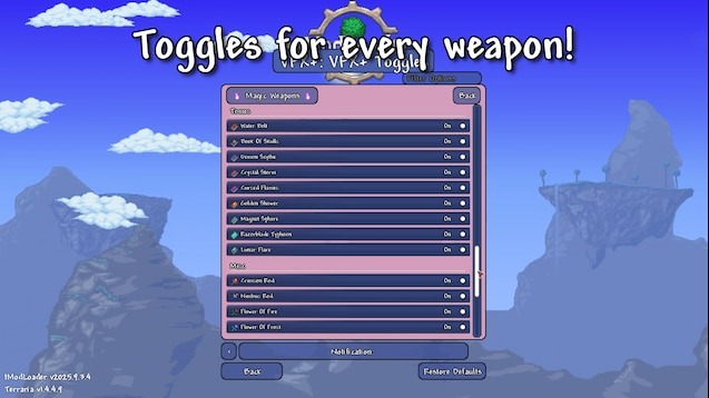 VFX+ — это мод для Terraria, который полностью перерабатывает визуальные эффекты игры, сохраняя при этом все механические функции. Основная цель мода — улучшить эстетическое восприятие оружия и заклинаний, делая их более выразительными и эффектными, без влияния на игровой баланс. Каждое изменение можно гибко включать или отключать через настройки, что позволяет адаптировать мод под собственные предпочтения.