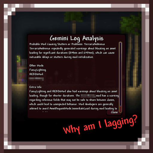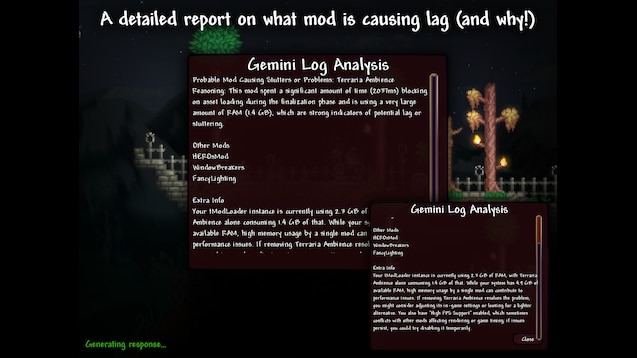 Whys My Game Lagging? — это мод для Terraria, который помогает быстро выявлять причины лагов, зависаний и ошибок при запуске больших модпаков. Он значительно упрощает анализ огромного client.log файла, предоставляя понятный отчет прямо в игре с помощью Google Gemini. Мод создан для того, чтобы экономить время и нервные клетки игроков, давая точную информацию о проблемных модах, ошибках и «тяжелых» ресурсах.