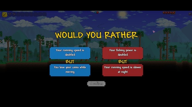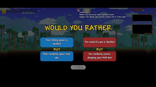 Жизнь полна непростых решений, и теперь мир Terraria тоже! Мод «WouldYouRatherMod» привносит в игру механику, основанную на популярной концепции «Что бы ты выбрал?» (Would You Rather), делая каждое ваше приключение непредсказуемым и уникальным.