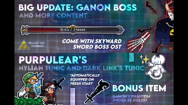 Zeldaria — это уникальный мод для Terraria, который добавляет новые предметы и контент, вдохновлённый серией The Legend of Zelda. Мод предлагает игроку полностью новую систему оружия и брони, включая различные версии Мастер-меча, луки и щиты, а также нового босса. Все предметы доступны в любом режиме игры и могут быть созданы с использованием стандартных ресурсов, что делает мод доступным для всех игроков без ограничений по сложности.