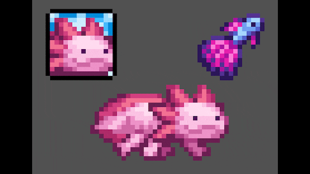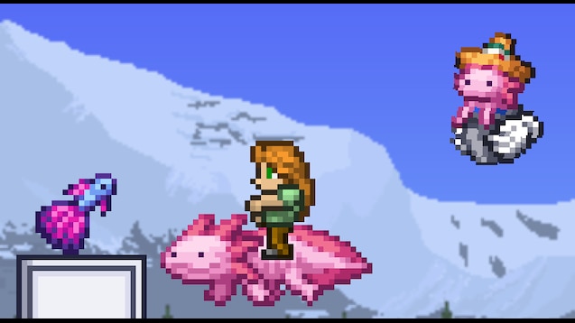 Текстура Axolotl Mount для Terraria преобразует классическое средство передвижения Cute Fishron Mount, которое получают после победы над Duke Fishron в режиме эксперт, в большого и милого аксолотля. Данный текстурный пак добавляет уникальные визуальные элементы и делает катание на маунте ещё более забавным и привлекательным. Все элементы — от предмета призыва до иконки баффа — оформлены в тематике аксолотля, а также включена локализация и переводы на испанский язык.
