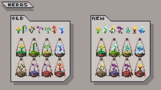 Текстурный пак Better Herbs для Terraria перерабатывает внешний вид растений, используемых в алхимии. Благодаря новым деталям и более разнообразному дизайну травы становятся заметнее в мире игры и выглядят более естественно. Обновленные текстуры делают сбор ингредиентов для зелий приятнее, а окружающую среду — живее и атмосфернее.