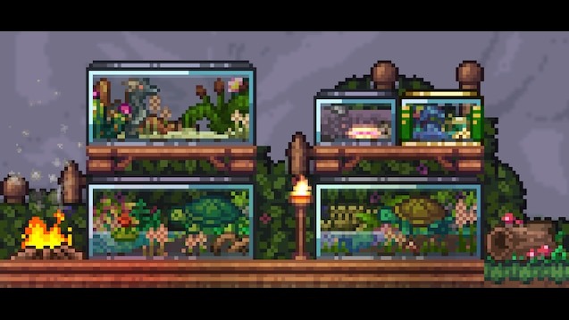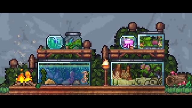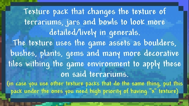 Better Terrariums — это текстурное улучшение для Terraria, направленное на переработку террариумов и декоративных ёмкостей с существами. Пак делает их менее пустыми и более атмосферными, добавляя внутрь природные элементы окружения: растения, камни, брёвна, самоцветы и другие детали, встречающиеся в мире игры. При этом внешний вид самих животных и их анимации остаётся без изменений — обновляется только оформление среды внутри ёмкостей.