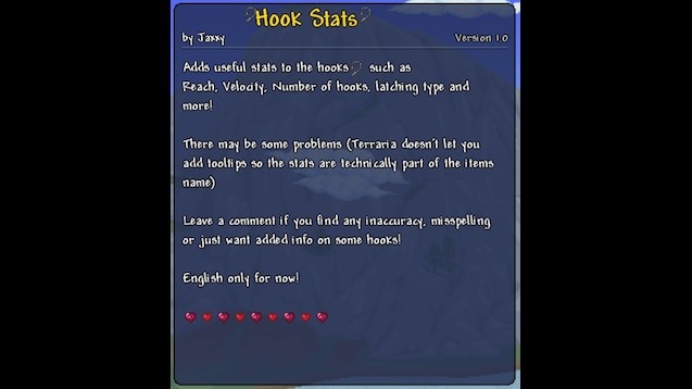 Текстурный пак Hook Stats для Terraria улучшает интерфейс предметов, добавляя подробную статистику к различным крюкам в игре. Благодаря этому игроки могут сразу увидеть важные параметры снаряжения и легче подобрать подходящий крюк для исследования мира, передвижения и сражений. Пак аккуратно интегрируется в существующие описания предметов и делает информацию более наглядной и полезной.